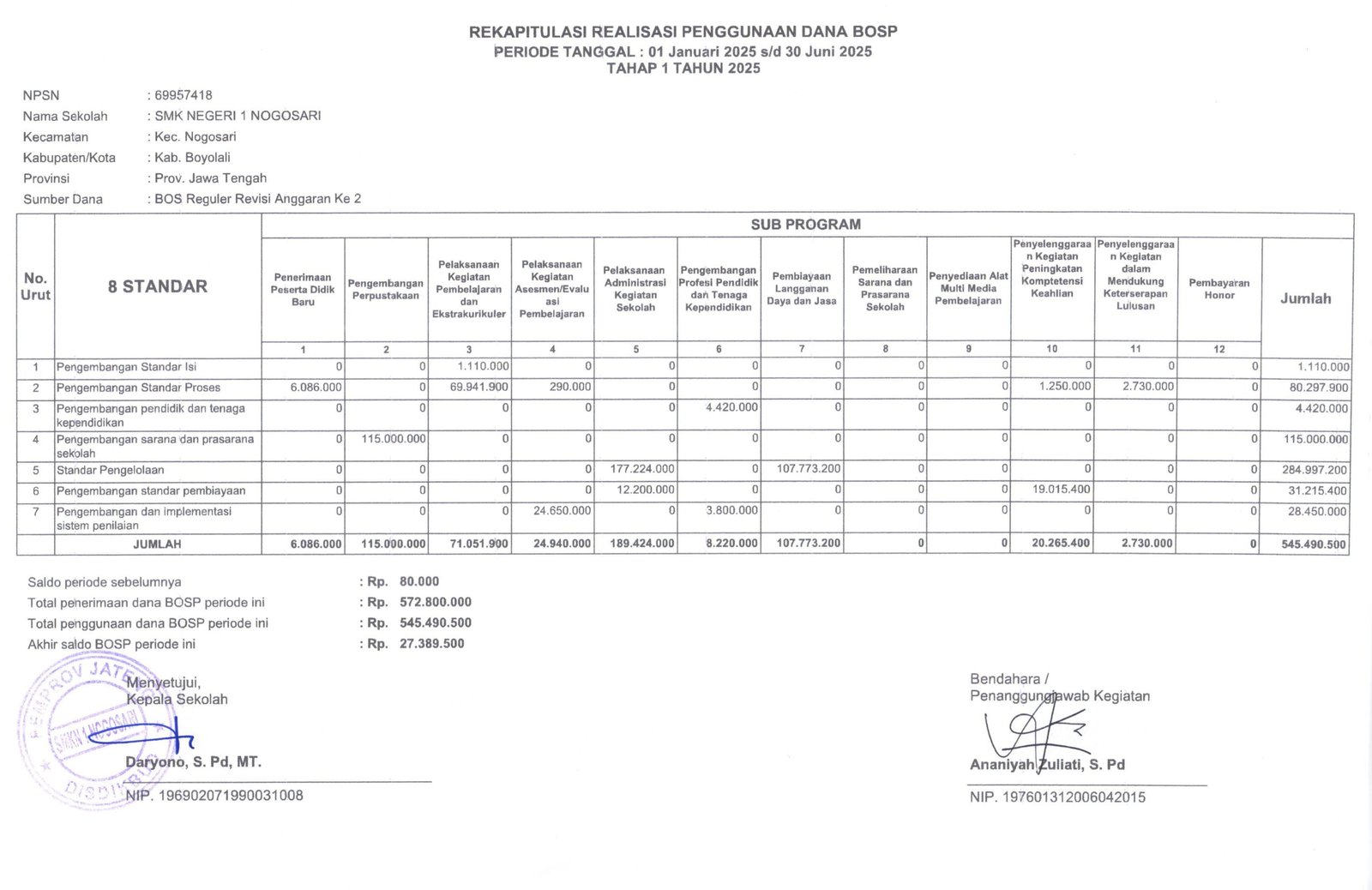 admin 24/07/2025 Bagikan ke:Berikut Kami Sampaikan Realisasi Penggunaan Dana BOSP Tahap 1 Tahun 2025 SMK Negeri 1 Nogosari. ← SELAMAT HARI ANAK NASIONAL TAHUN 2025 JUMBARA PMI KE-IX BABUPATEN BOYOLALI TAHUN 2025 →
